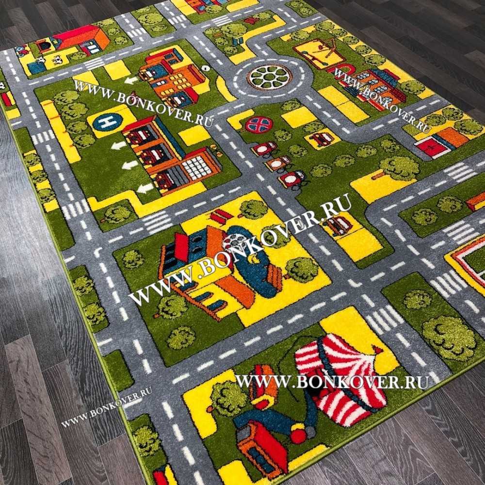 Напольные покрытия для детской комнаты - это всегда яркие цвета, интересные рисунки. Дизайн новинки станет отличным решением для оформления комнаты, где живет ваш малыш. Полотно ковра украшает яркий и занимательный рисунок. Использование износостойких материалов позволило создать Детский Ковер Город 02 Зеленый с мягким, приятным при ходьбе ворсом, который обладает антистатическими и гипоаллергенными свойствами.
